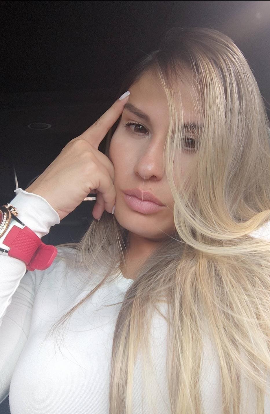 Sun-kissed blonde hair flowing down her back, soft lips, sultry side profile, and curves that demand attention: full, perky bust spilling out of this sheer bra, tiny waist, and that juicy, round, heart-stopping booty you can't look away from. The pink heart gloves and matching thong? Just a little tease to make you weak at the knees. Fresh, pampered, always smelling sweet, and ready to play.