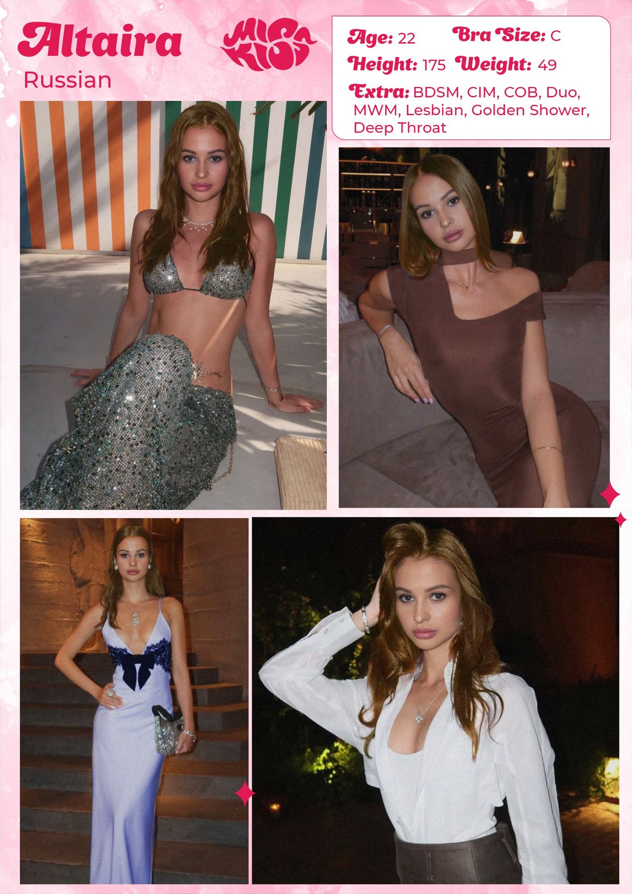 Welcome to MissKiss escort agency! Here you will find not only beautiful models, but also first-class service that will make your evening unforgettable.