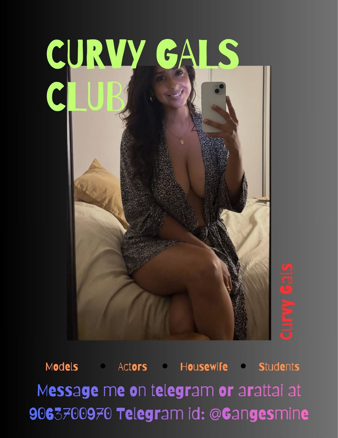 a sexy and busty chick who will make your dreams come true.Come and enjoy spicy sex full of passion. My menu includes adventurous positions like doggy style and 69, passionate oral and anal play, intimate kissing, and other exciting options.Message me on telegram or arattai Telegram id: @Gangesmine