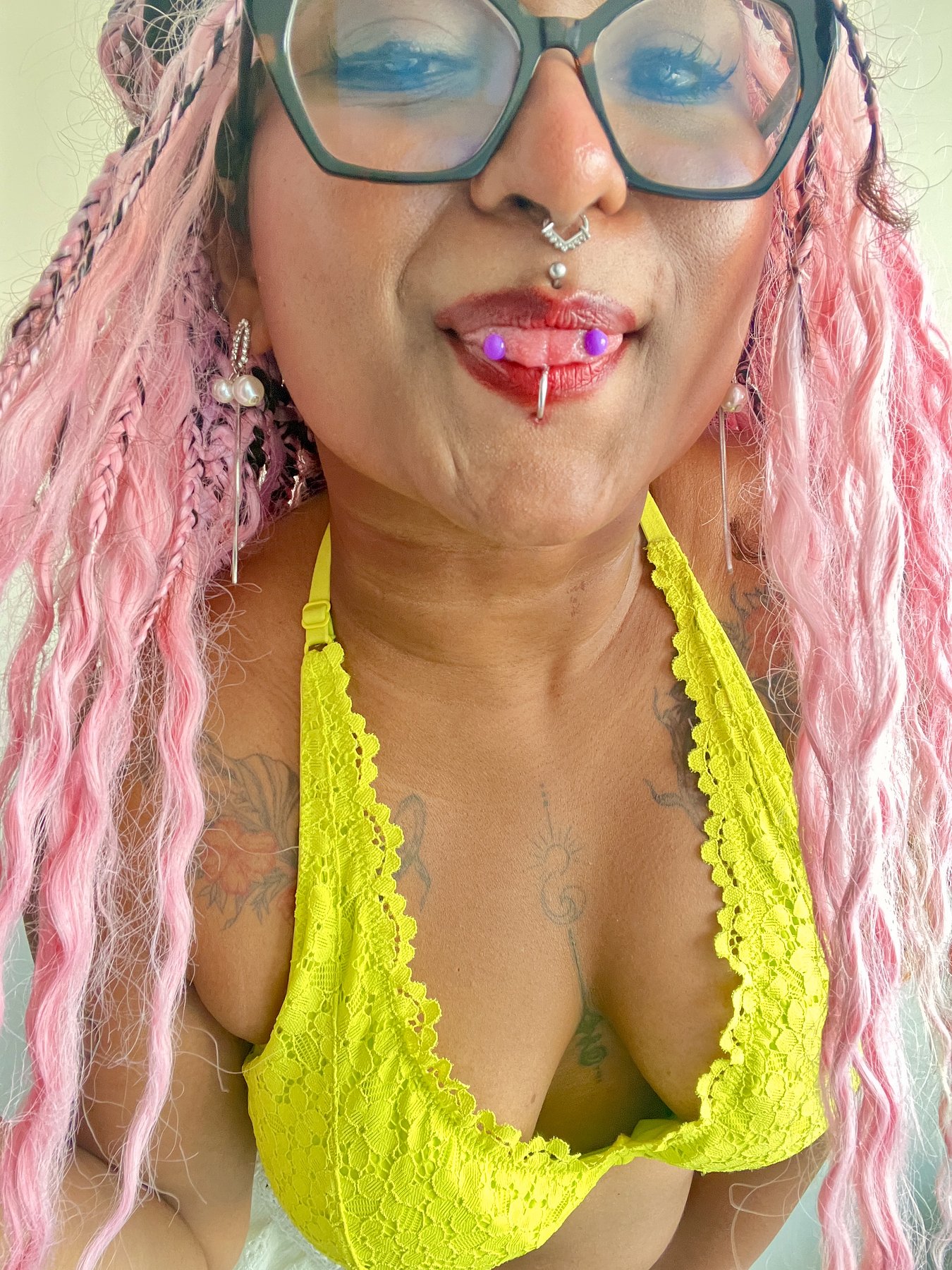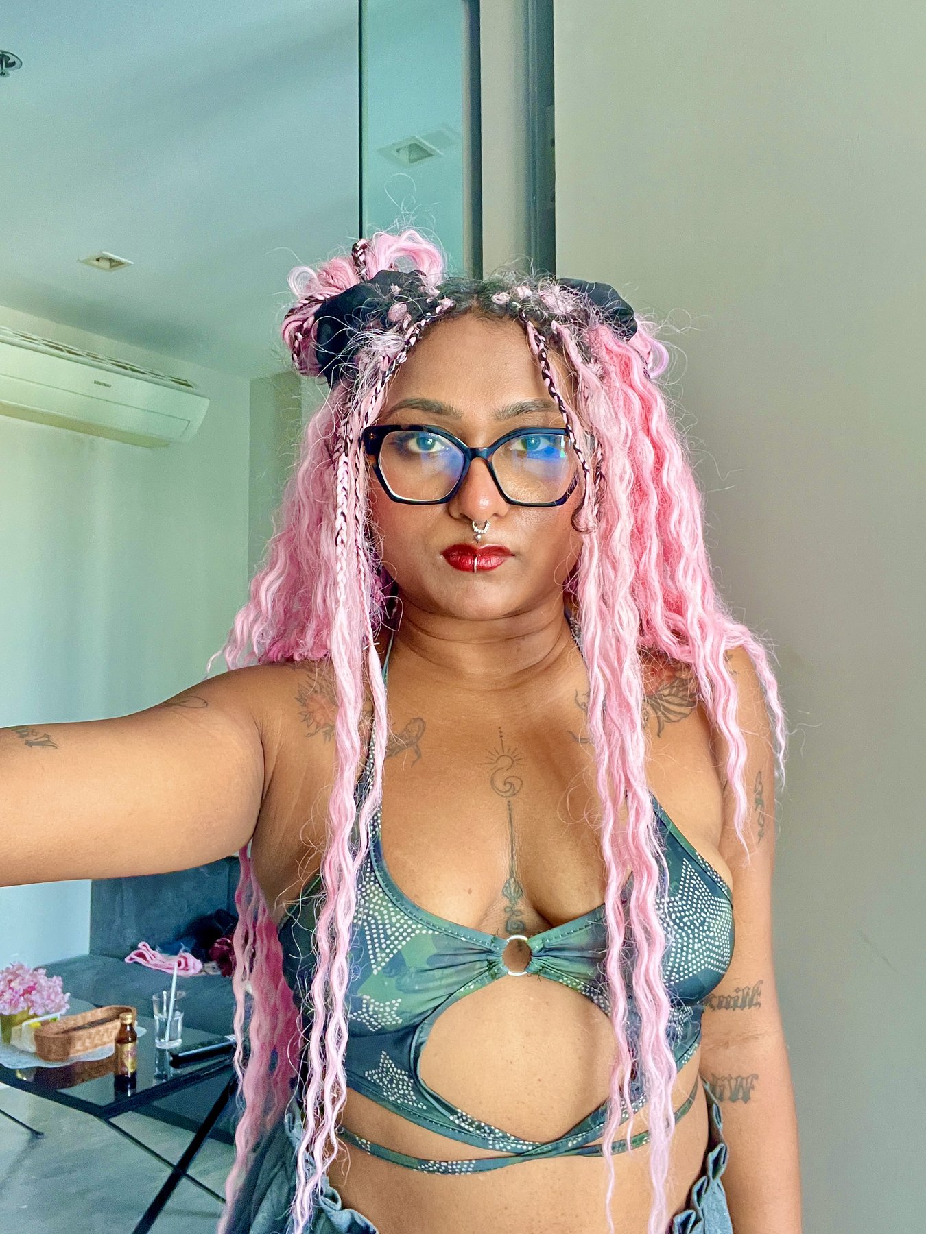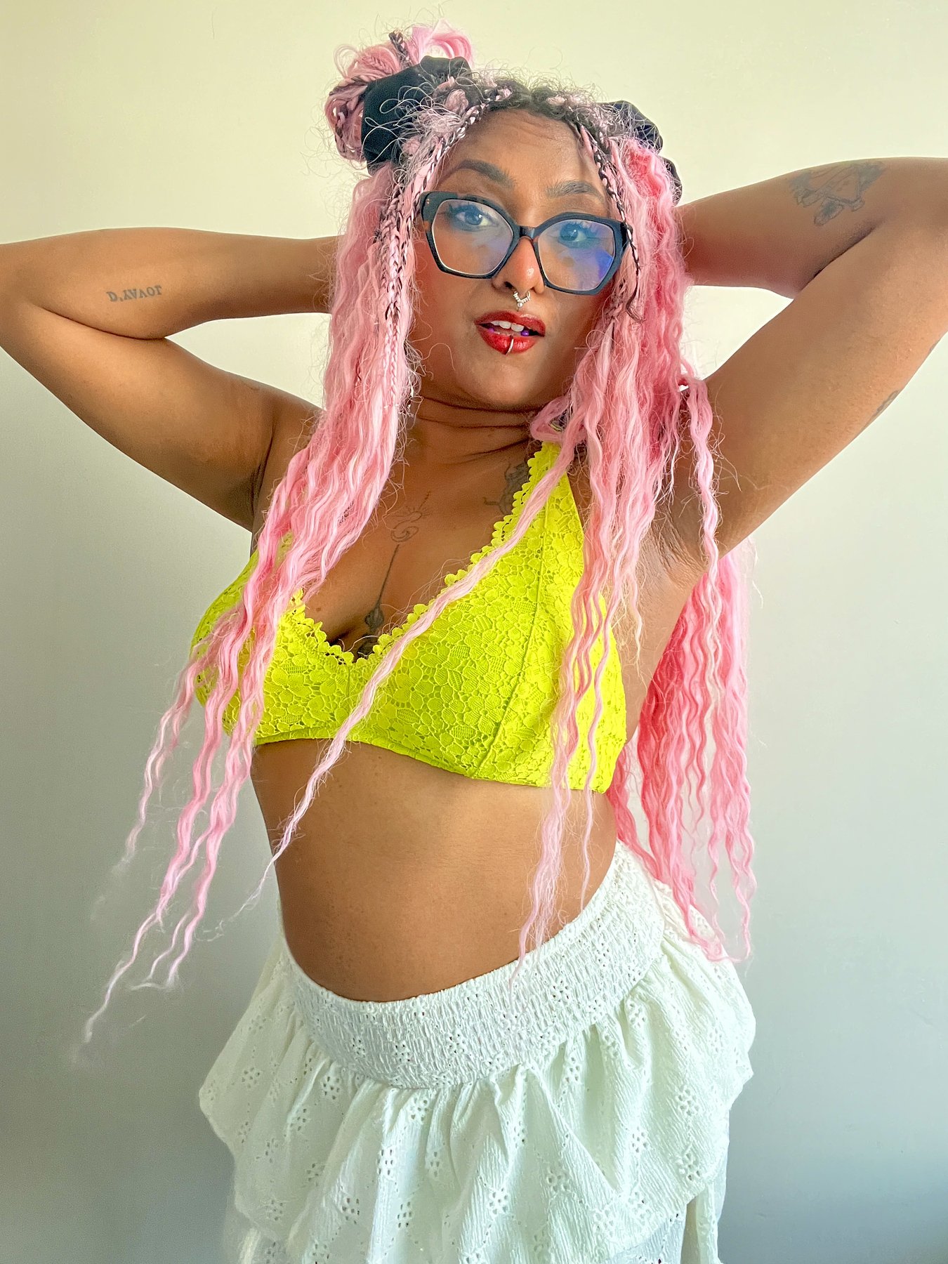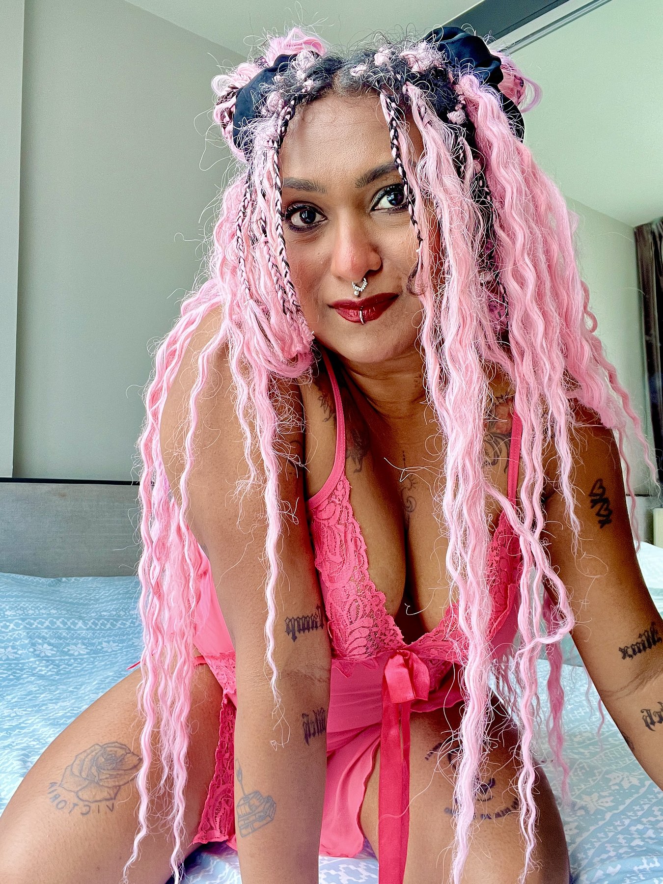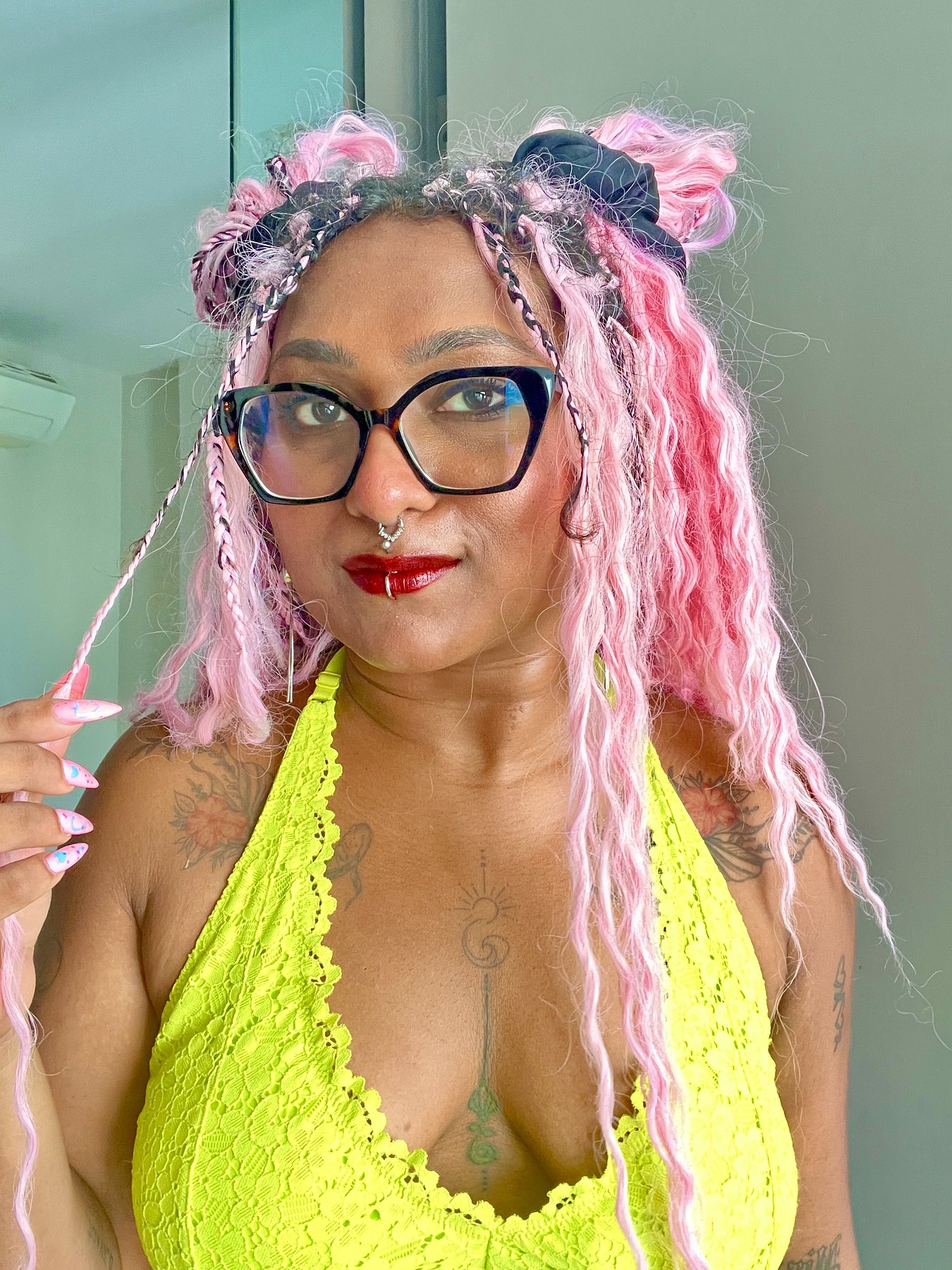 I'm Simi with pink long hair, tattoos and piercings